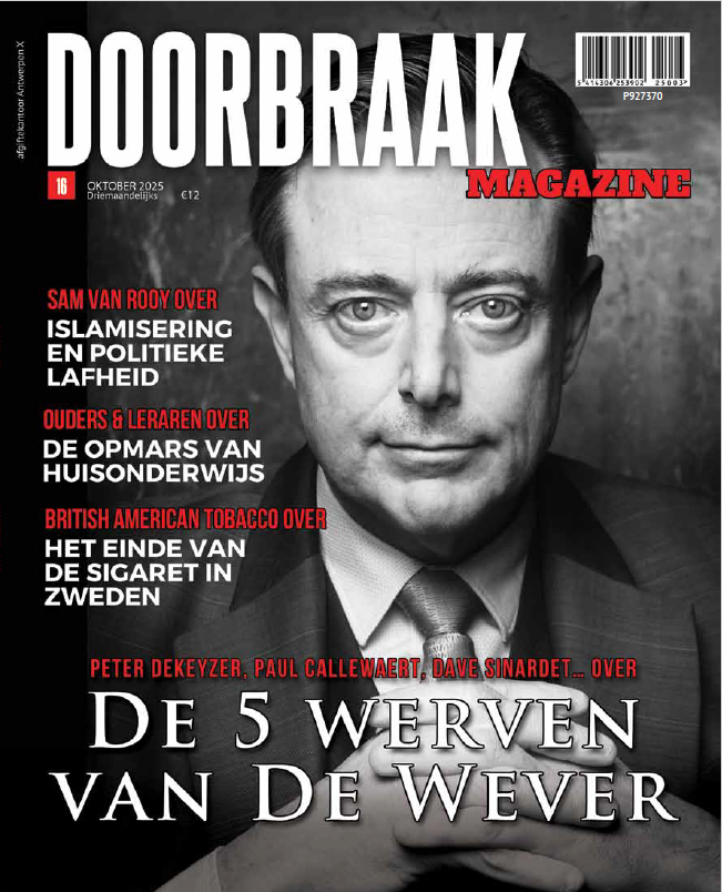 | #16 Oktober 2025 | De Wever en ‘zijn’ 5 werven: 2026 wordt een sleuteljaar voor de regering De Wever. Doorbraak selecteert vijf werven voor de premier en zijn gevolg. Van onze industrie redden over de asielinstroom beperken tot onze pensioenen betaalbaar houden. De opmars van het huisonderwijs: In Vlaanderen volgen ruim 5.000 kinderen huisonderwijs. Dat lijkt peanuts, maar sinds de coronapandemie is hun aantal bijna verdubbeld. De motieven lopen sterk uiteen, wij spraken met een dozijn huisonderwijzers. Islamisering: taboe in Belgenland: Sam Van Rooy (Vlaams Belang) klaagt het oprukkende islamisme in België al jarenlang aan. Roepen in de woestijn, zo leek het lange tijd, maar nu geven de feiten hem ook stilaan gelijk. “We zijn vaak te laf in dit land.” De Brusselse malaise door de bril van een expat: Volgens Philip Herd, hoofdredacteur van de Brusselse online expatkrant The Brussels Times, oogt het bilan van Brussel niet fraai. Gelukkig reikt hij ook oplossingen aan. Belgische ertsen: ondergronds en onontgonnen Ja, er zitten nog waardevolle metalen in onze bodem. Zink, en wellicht zoveel meer. De hamvraag: zijn we bereid om dat ertspotentieel te ontdekken via meting & onderzoek? De Groot-Nederlandse wensdroom van de premier: De Groot-Nederlandse droom is springlevend. Als we onze premier mogen geloven, tenminste. Hij heeft de geschiedenis in ieder geval aan zijn kant. Axel Buyse leert ons ook dat elke natie of staat, die naam waardig, fragiel is… De Portugese braindrain: In het land van de gegrilde sardientjes en de melancholische klanken van de fado voltrekt zich een exodus. Van jong, ambitieus en hoogopgeleid talent. Omdat de lonen er veel te laag zijn en de vastgoedprijzen veel te hoog. Zweden: van sigaret naar (nicotine)zakjes: In Zweden zoekt een tabaksgigant zijn redding in… nicotinezakjes. Maar ook overheid en wetenschappers zitten op dezelfde lijn. Daardoor rookt amper nog vijf procent van de bevolking. Doorbraak ging de sfeer opsnuiven in Stockholm. Hoe Blaise Metreweli MI6 de 21ste eeuw binnenloodst: Sinds 1 oktober is Blaise Metreweli het nieuwe hoofd van MI6, de Britse geheime dienst. Van Miss Moneypenny tot Agent Fifi: vrouwen bewijzen al langer hun waarde bij MI5 en MI6. Hun handelsmerk? Tech, tactiek en discretie aan de top. De lucratieve alliantie tussen Rusland en Afrika: Terwijl er aan de rand van Europa nog steeds een oorlog woedt, is Rusland ook in Afrika militair, politiek én economisch alomtegenwoordig. Ver weg van de schijnwerpers, maar de geopolitieke belangen zijn er niet minder om… ‘Ras’ in medische wetenschap: levensnoodzakelijk: Mensen zijn één soort, de homo sapiens, maar er zijn wel degelijk verschillen, onder te verdelen naar ras. Zeker in de medische wetenschap heeft ‘ras’ nog veel relevantie. Meer nog, de erkenning ervan redt vele mensenlevens. Utopisch wensdenken in Europa: Europese politici verschuilen zich maar al te graag achter wensdenken. Ondertussen stagneert Europa, met Duitsland op kop. Ivan van de Cloot legt de EU-kwetsbaarheden feilloos bloot. De peetvader van het ethisch ondernemen: Louis Verbeke is in ons land pionier van de Angelsaksisch geïnspireerde advocatenkantoren én peetvader van de corporate governance. De geknipte man om de traagheid van onze gerechtelijke molen te fileren. Streng maar rechtvaardig. In beeld: de verdwenen Grieken van Pontos: In Noord-Turkije werden begin vorige eeuw de Pontische Grieken geëlimineerd. In kerken, kathedralen en moskeeën zie je nog eeuwenoude iconen die het verhaal vertellen van een verdwenen beschaving. Harold Van de Perre: glasheldere kunst: Artistieke duizendpoot Harold Van de Perre noemt zichzelf een ‘afwijking’ in de huidige kunstwereld, maar is bovenal een van onze grootste glasraamkunstenaars. “Als mijn ramen over vijftig jaar nog licht vangen en mensen ontroeren, is mijn doel bereikt.” Johan Sanctorum: Witloof met hespenrolletjes en kaassaus Rik Torfs: De grens snijdt als een mes door de velden Siegfried Bracke: Waarover u nog niets hebt gelezen | |